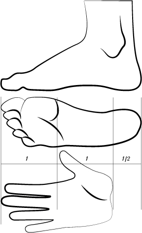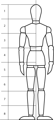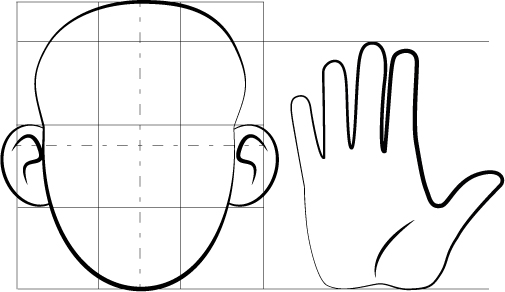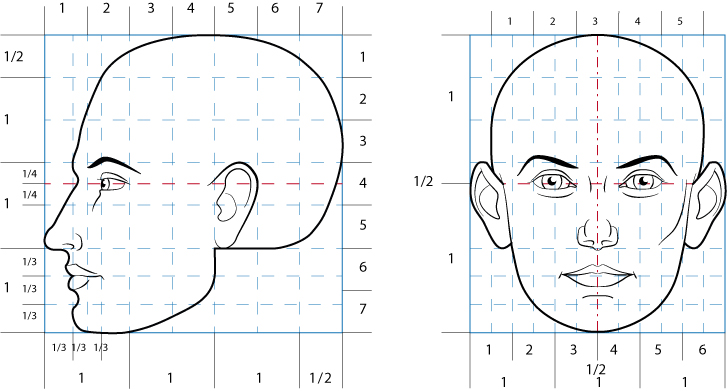 Le profil d'un visage s'insert dans un carré divisé en trois parties et demi. Horizontalement du menton à la base du nez, des surcils à la base des cheveux. La ligne des yeux se situe au milieu du visage, un quart au dessous des surcils.
